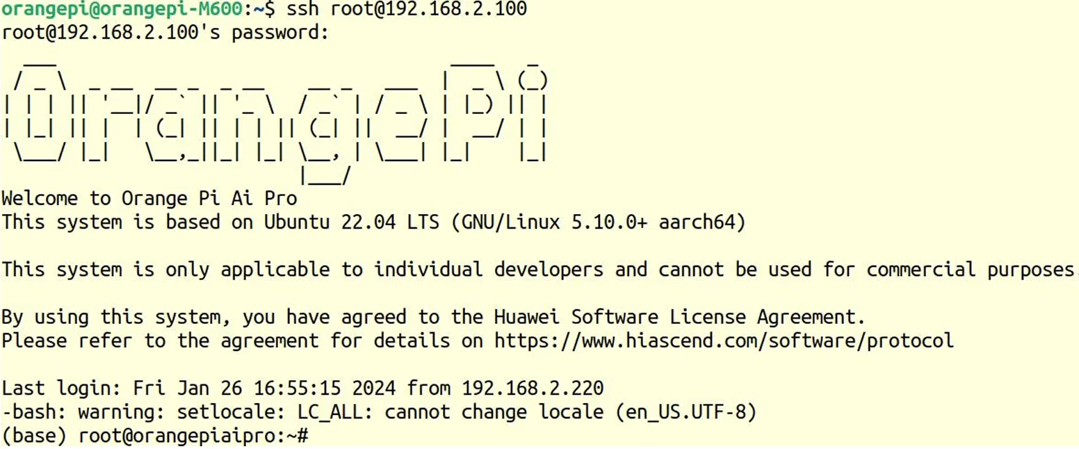 ssh username@192.168.1.XXX输入香橙派账号默认密码Mind@123。连接成功后打开远程终端,执行并检查是否连接成功