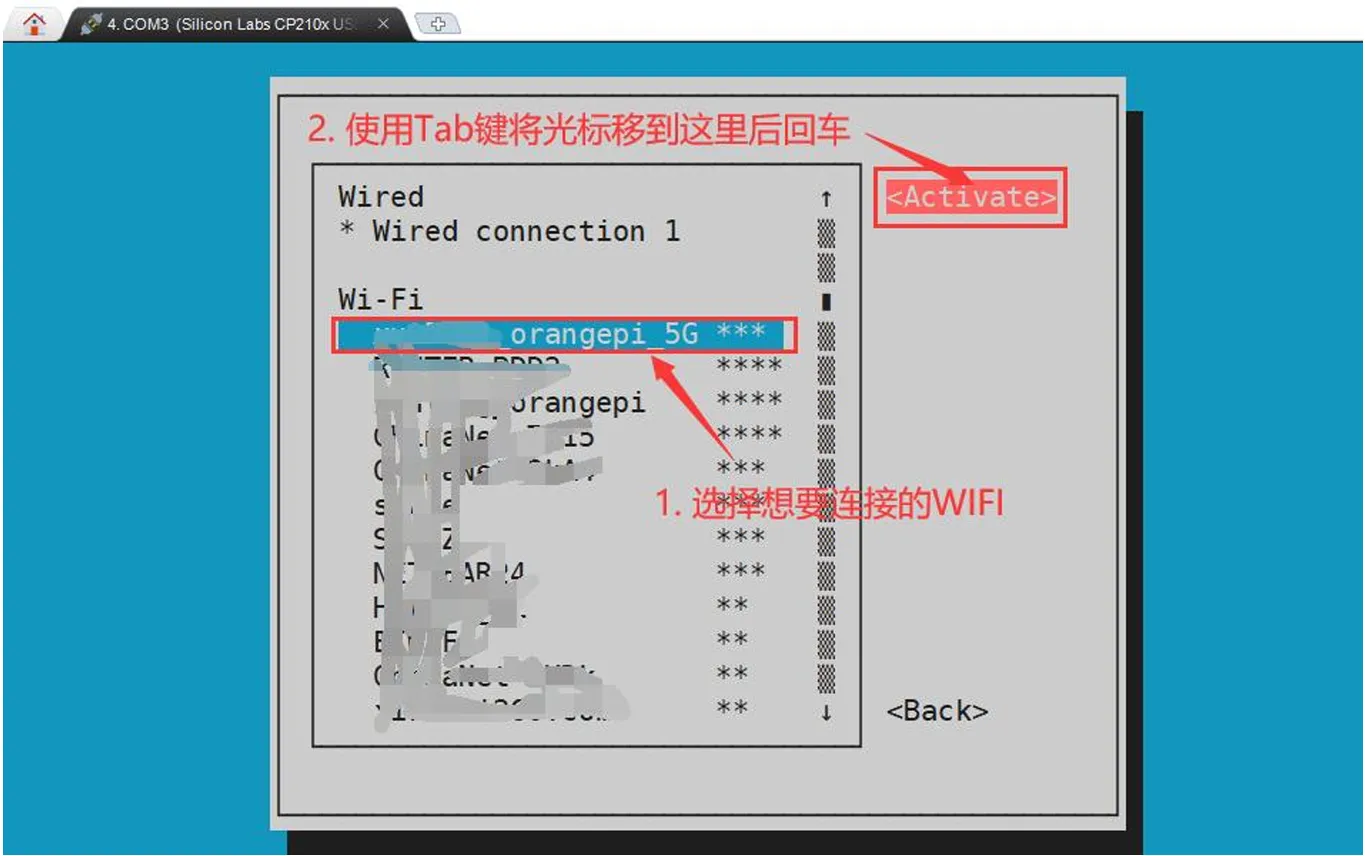 选择想要连接的WIFI热点后再使用Tab键将光标定位到Activate后回车